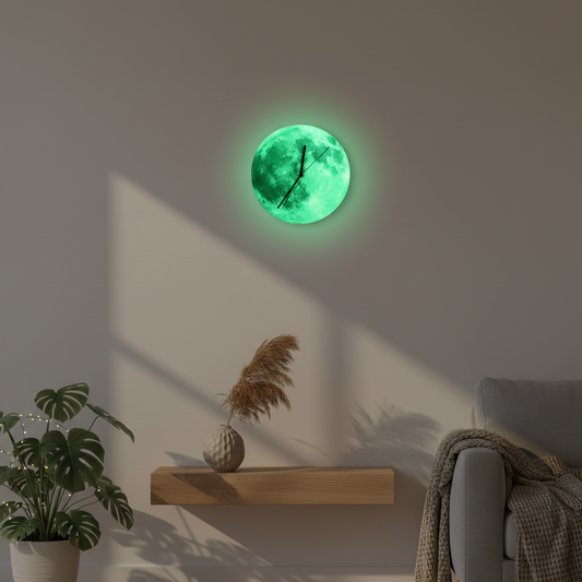 Lunaris Glow | Glow-in-the-Dark Mond-Wandklok | Lichtgevend Wandontwerp voor Dag & Nacht