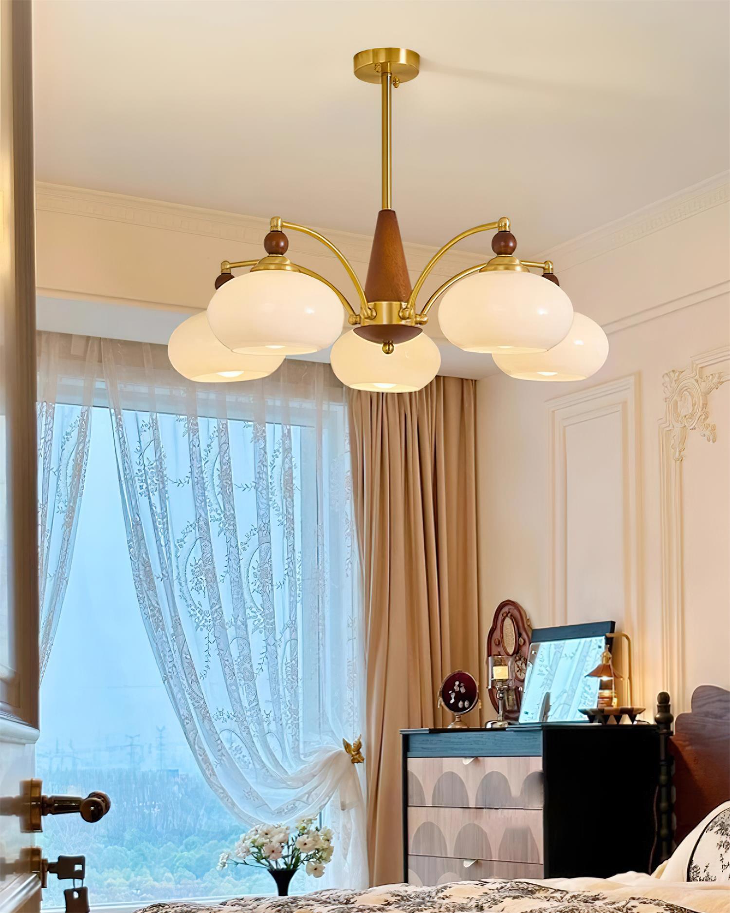 De Meliora kroonluchter combineert historische elegantie met hedendaags design. Geïnspireerd door de esthetiek van vervlogen tijden, overtuigt hij door zijn hoogwaardige afwerking van hout, metaal en glas. De goudkleurige kappen creëren een zacht, warm licht dat elke ruimte een gezellige en stijlvolle sfeer geeft – perfect voor woonkamers, eetgedeeltes of stijlvolle werkkamers.